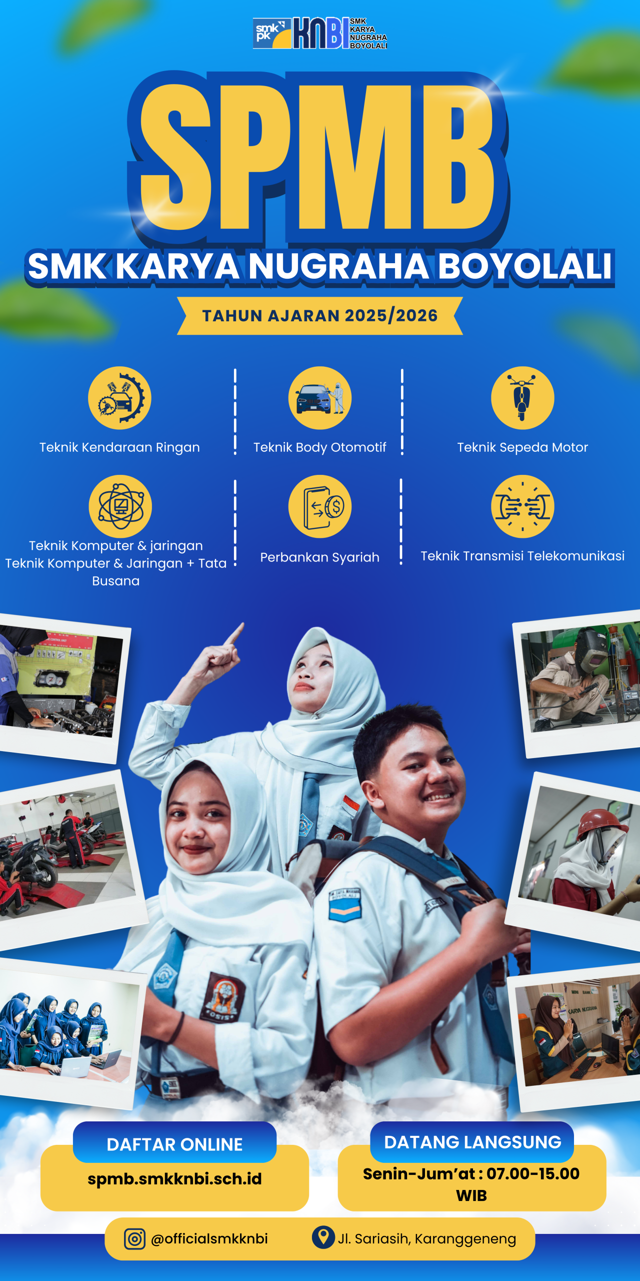 silahkan Akses spmb.smkknbi.sch.id Untuk mengetahui lebih alnjut tentang informasih pendaftaran di SMK Karya Nugraha Boyolali tahun Ajaran 2025/2026
